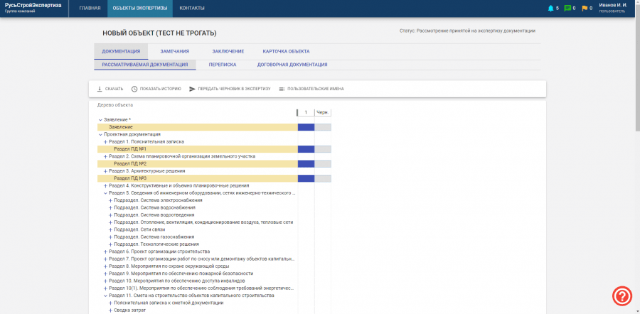 После загрузки документации в правом верхнем углу необходимо нажать "Изменить статус" -> "Передать в экспертизу".